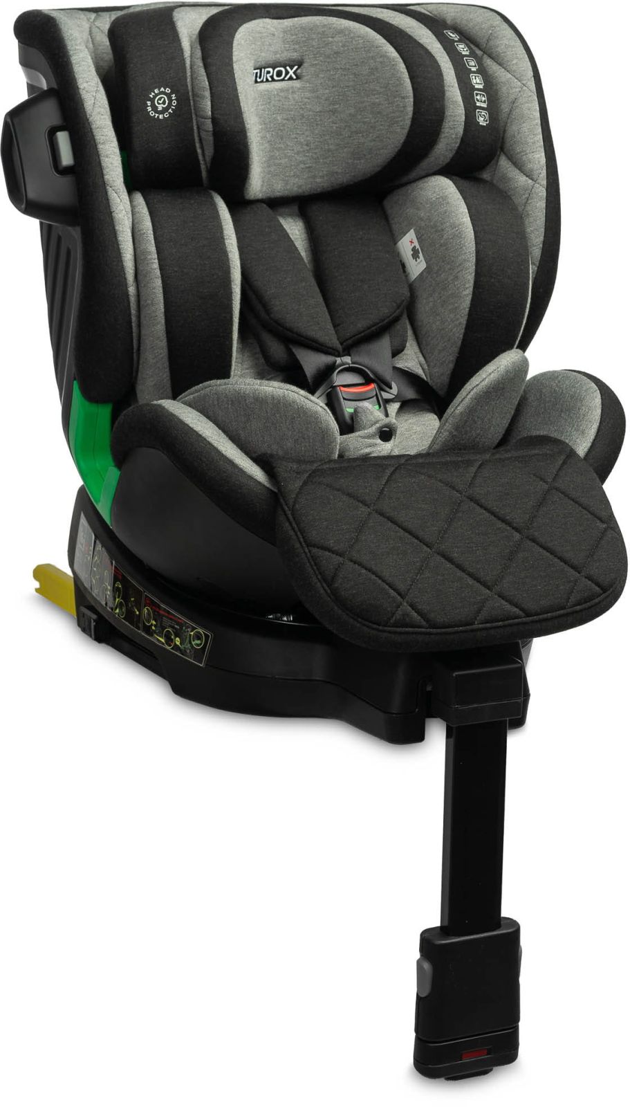 Turox je integrován se základnou, která umožňuje otáčení autosedačky o 360 stupňů, takže rodič bude moci snadno usadit dítě do sedačky nebo změnit směr jízdy bez opětovného upevnění.