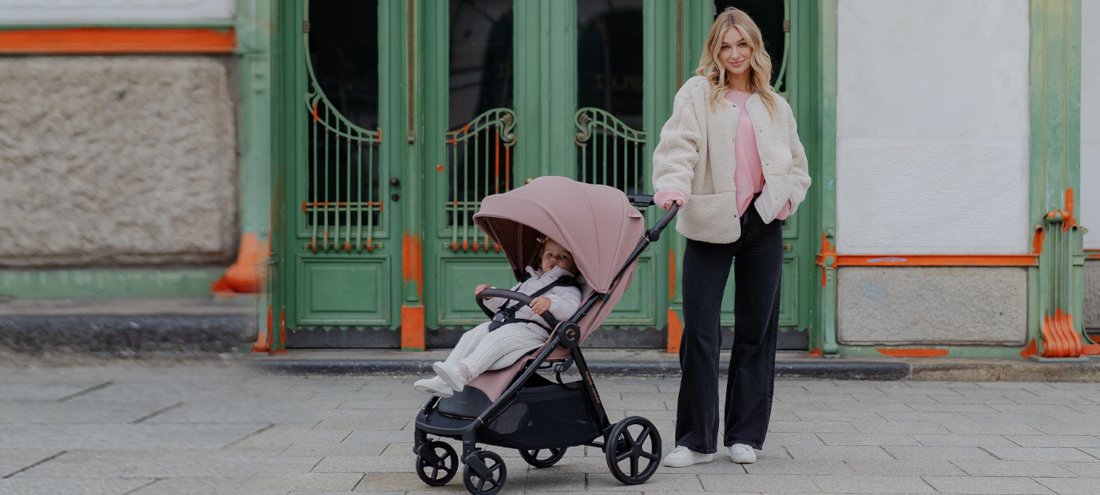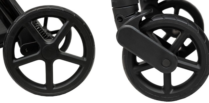 PU kola s přídavkem gumy zlepšují tlumení nárazů a trakci na různých površích. Kočárek se řídí plynule, stabilně a předvídatelně, a to i při plném zatížení. Přepracovaný brzdový pedál je intuitivní a šetrný k obuvi (stop & go). Další reflexní prvky zvyšují viditelnost po setmění a za oblačných dnů.